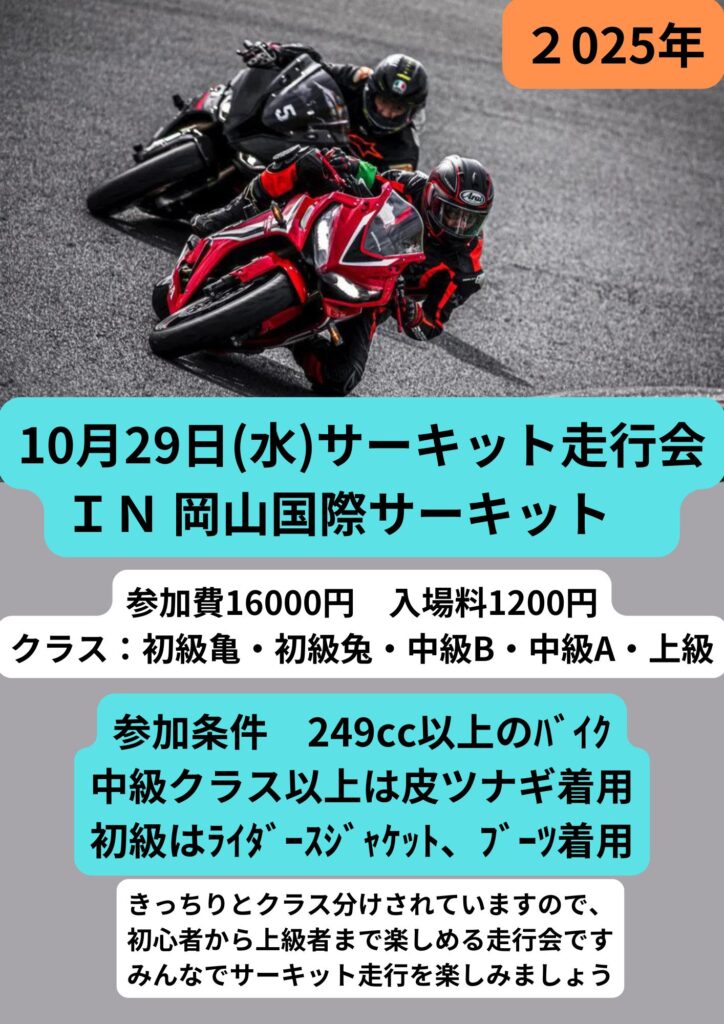 10月29日(水)岡山国際サーキットにて走行会が開催されます